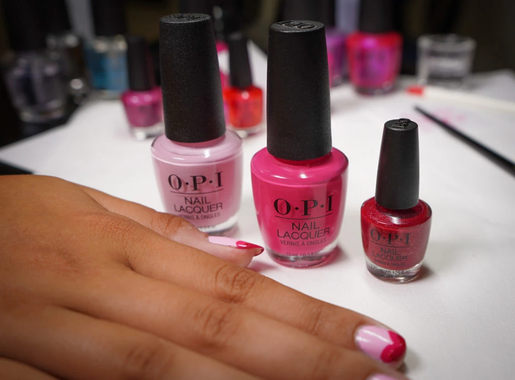 Los colores seleccionados por O.P.I para el diseño de San Valentín son 'Mod About You' como base (del que se van a aplicar dos capas de manera continua, pero siempre esperando que se termine de secar la primera). Para el corazón principal utilizamos el tono 'Strawberry margarita' (corazón grande), mientras que para el corazón pequeño hay dos alternativas de tonos similares: 'Im not really a waitress' y 'Im really an actress'.