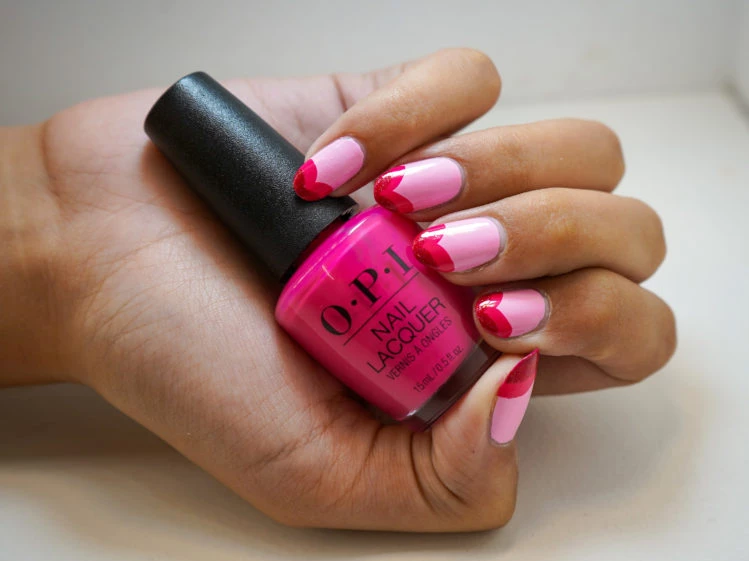 Los colores seleccionados por O.P.I para el diseño de San Valentín son 'Mod About You' como base (del que se van a aplicar dos capas de manera continua, pero siempre esperando que se termine de secar la primera). Para el corazón principal utilizamos el tono 'Strawberry margarita' (corazón grande), mientras que para el corazón pequeño hay dos alternativas de tonos similares: 'Im not really a waitress' y 'Im really an actress'.