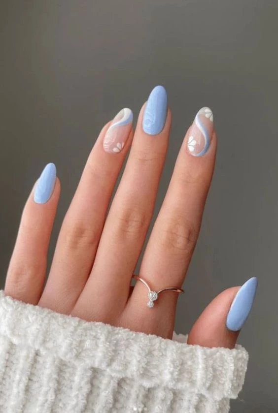 Si buscas resaltar tus uñas celestes, el nail art es una excelente opción. Un diseño delicado con flores con una base de vía láctea o transparente en al menos dos uñas harán que tus manos sean llamativas, pero sin perder delicadeza.