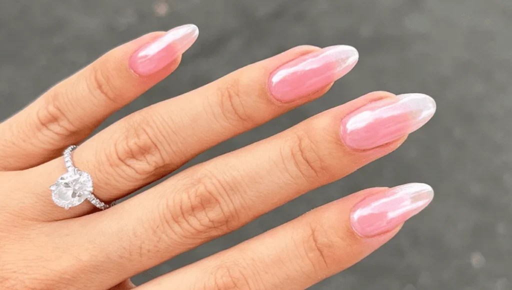 El estilo dona glaseada o chrome white que pinta las uñas en tono perlado con una base blanca transparente es un diseño bien natural, minimalista y muy elegido por las novias.