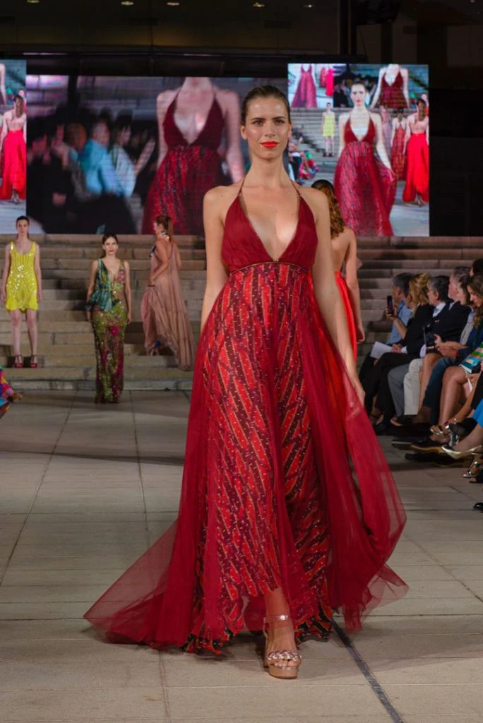 Las diferentes configuraciones de los vestidos que están acompañados con detalles en plata o negro, generan un toque modernidad en la prenda y definen la silueta de la mujer que Benito quiere representar.