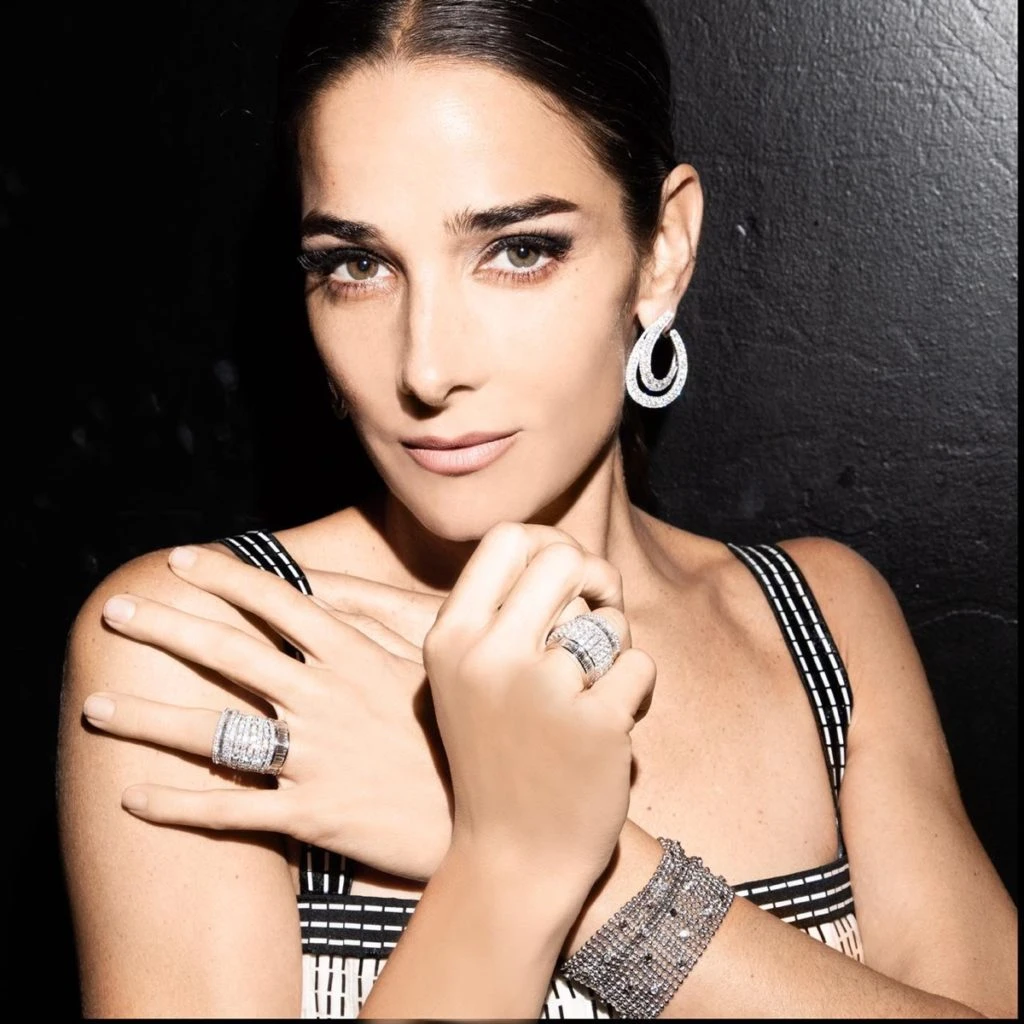 Lo acompañó con joyas en oro blanco y brillantes y sandalias altas en color negro.