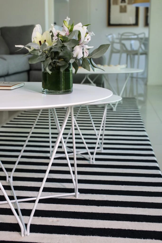 Dueño de una vista privilegiada hacia la plaza San Martín, en Retiro, el living comedor ambientado por la arquitecta Karina Vinocur (@karina_vinocur) saca provecho de la luz natural y el verde que se cuelan desde el balcón. Hacia él mira el moderno sofá con diferentes módulos tapizado en lino gris (https://www.ladecoreria.com) y equipado con almohadones de terciopelo (Compañía de Comercio) y una manta de lana (https://elementosargentinos.com.ar/es/). Sobre una alargada alfombra de lana rayada (https://www.kalpakian.com/) se destacan tres mesas redondas de diferentes tamaños, todas en chapa laqueada modelo Eden (http://www.federicochurba.com.ar/). Las cortinas son roller sunscreen (https://www.hunterdouglas.com.ar/).
