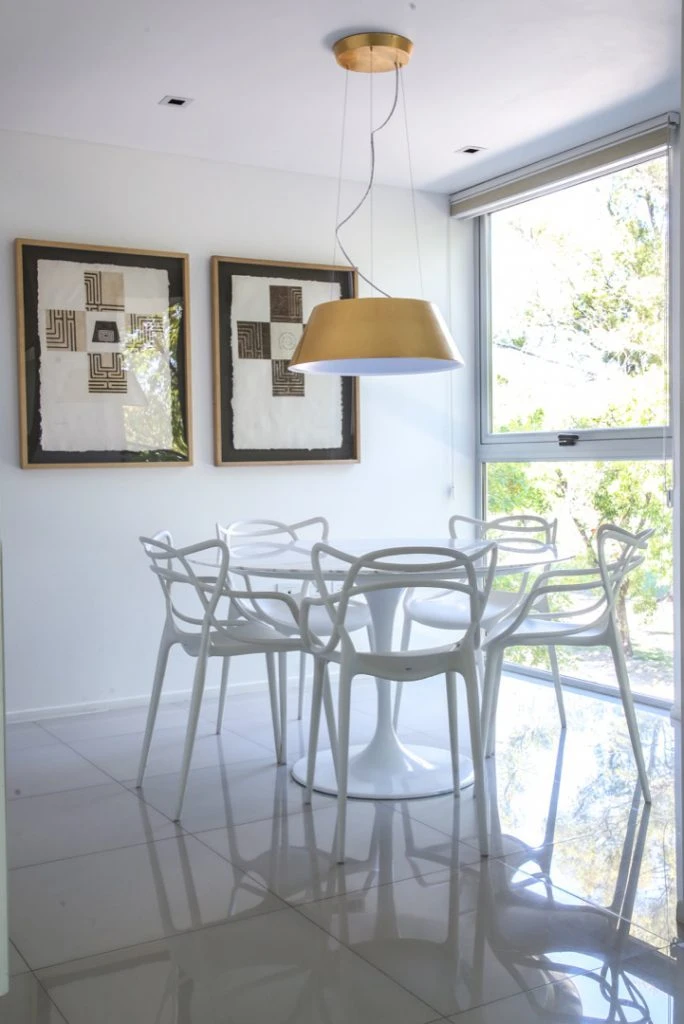El comedor es muy escenográfico. Sobre los pisos de porcellanato blanco brilllante, una mesa circular Tulip con tapa de mármol Calacatta encuentra compañía perfecta en las sillas Master, célebre diseño de Antonio Citterio (Manifesto). Rompe con el dominio del blanco la lámpara dorada Phillips para http://lograsso.iluminacion.com.ar/). Un par de obras de la artista Aída Chertkoff completan el espacio.