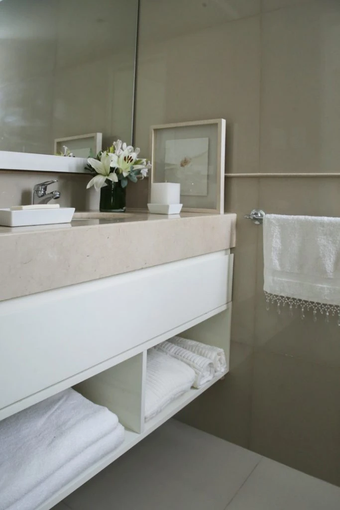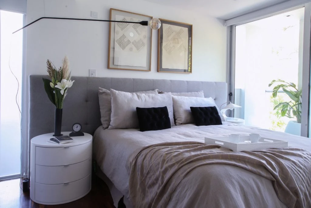 La suite tiene un respaldo butoné forrado en lino que se extiende por toda la pared. Para vestir el sommier se eligió un cubrecama de lino italiano, con almohadones de terciopelo negro capitoné (La Decorería) y manta a tono italiana como pie de cama (Ramos Generales). A la izquierda, una lámpara de pie con brazo largo pivotante (Punto y Coma) se ofrece como luz de noche. Al otro lado de la cama, sobre la mesa de luz compacta oval realizada a medida por el estudio de Karina Vinocur, asoma la lámpara Hanoi, popular diseño de Federico Churba (http://www.federicochurba.com.ar/). Un par de cuadros de Aída Chertkoff resaltan contra el blanco. Los pisos de madera (Patagonia) son los responsables de dar la nota cálida.