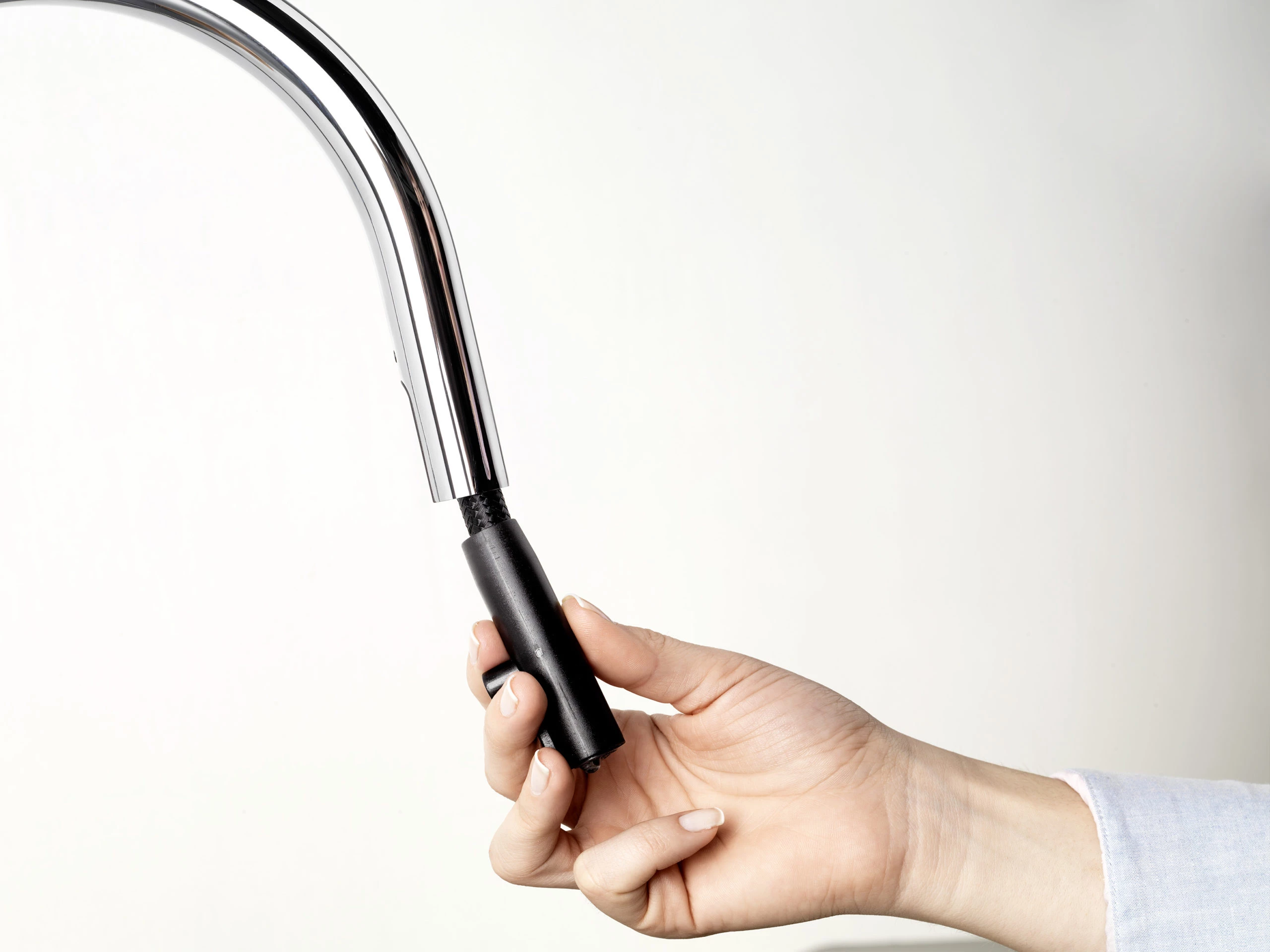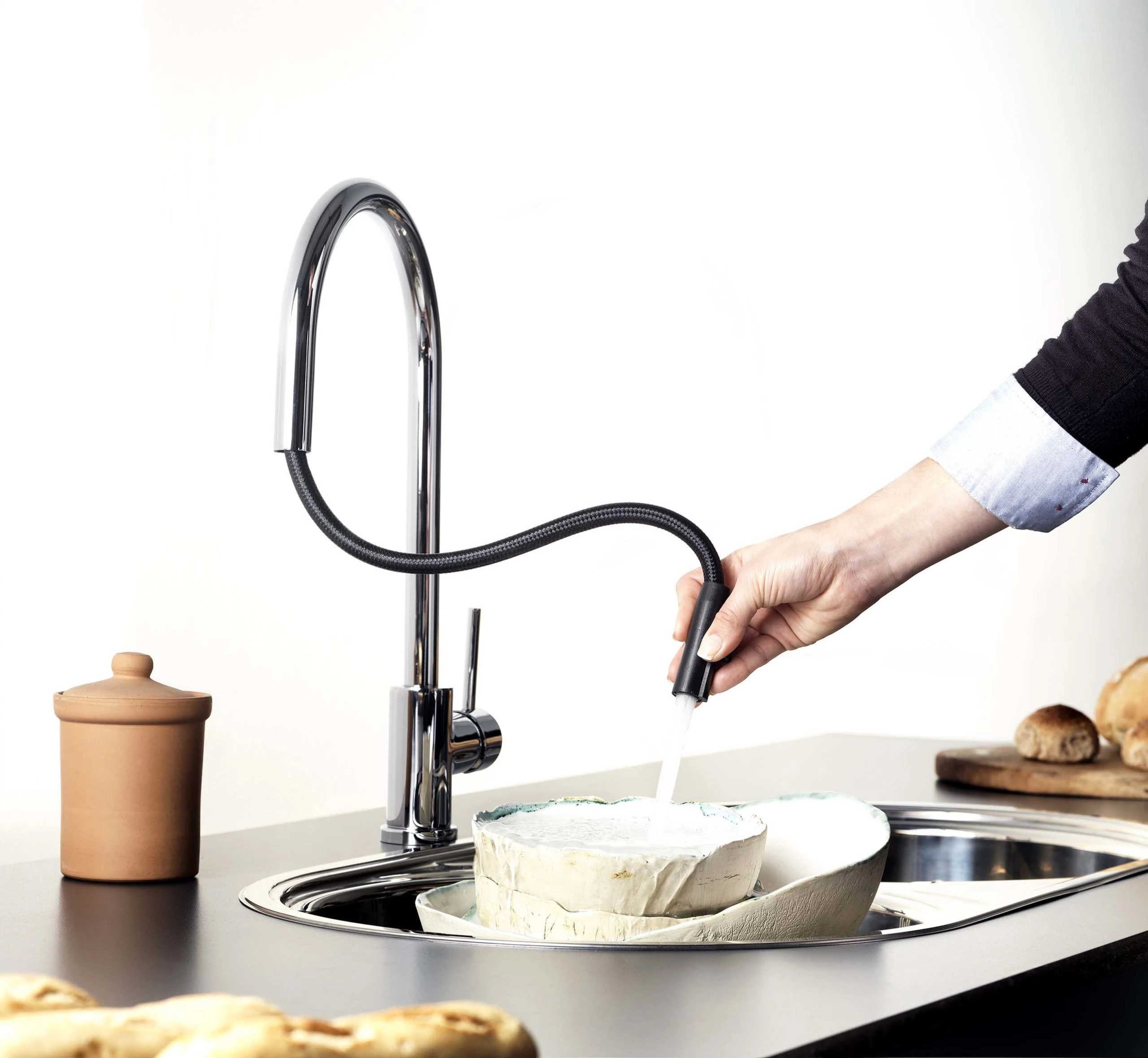 Su rociador interno extraíble queda oculto dentro del pico hasta el momento del uso, eso permite trabajar cómodamente en la limpieza de frutas, verduras y utensilios de cocina. La altura del pico, superior a los diseños tradicionales, es práctica para manipular piezas de gran tamaño.