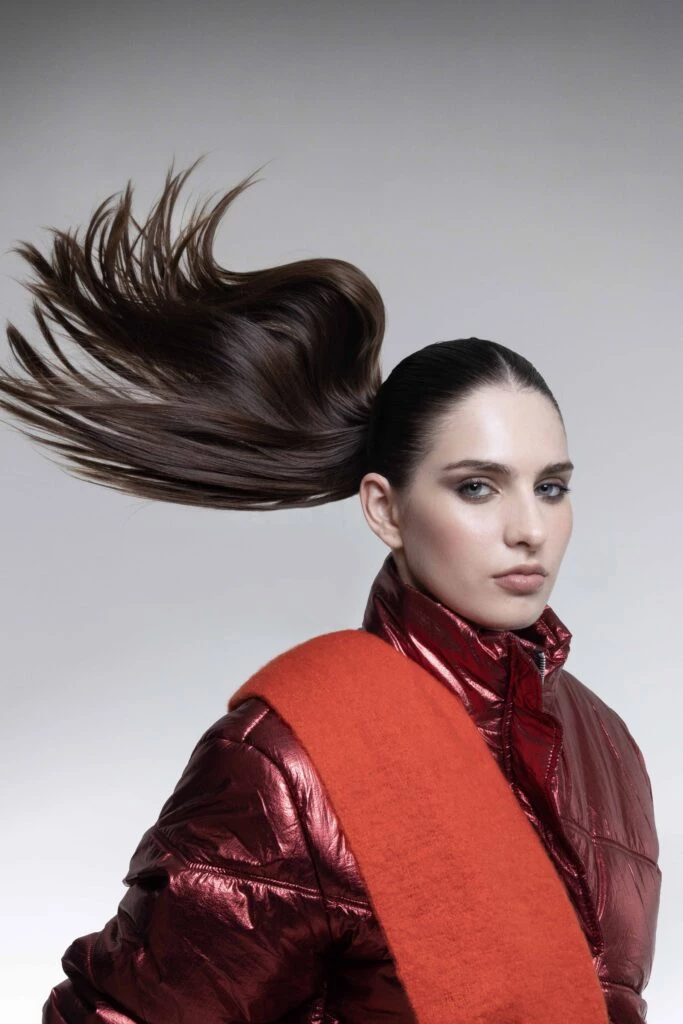 La season otoño invierno 2023 le pertenece a la estética puffer. Por ese motivo, el lacio glam y la ponytail son dos peinados ideales para utilizar también con aquellas prendas de características oversized, ya que la zona del cuello queda liberada para brindarle espacio a los cuellos altos de abrigos y bufandas.