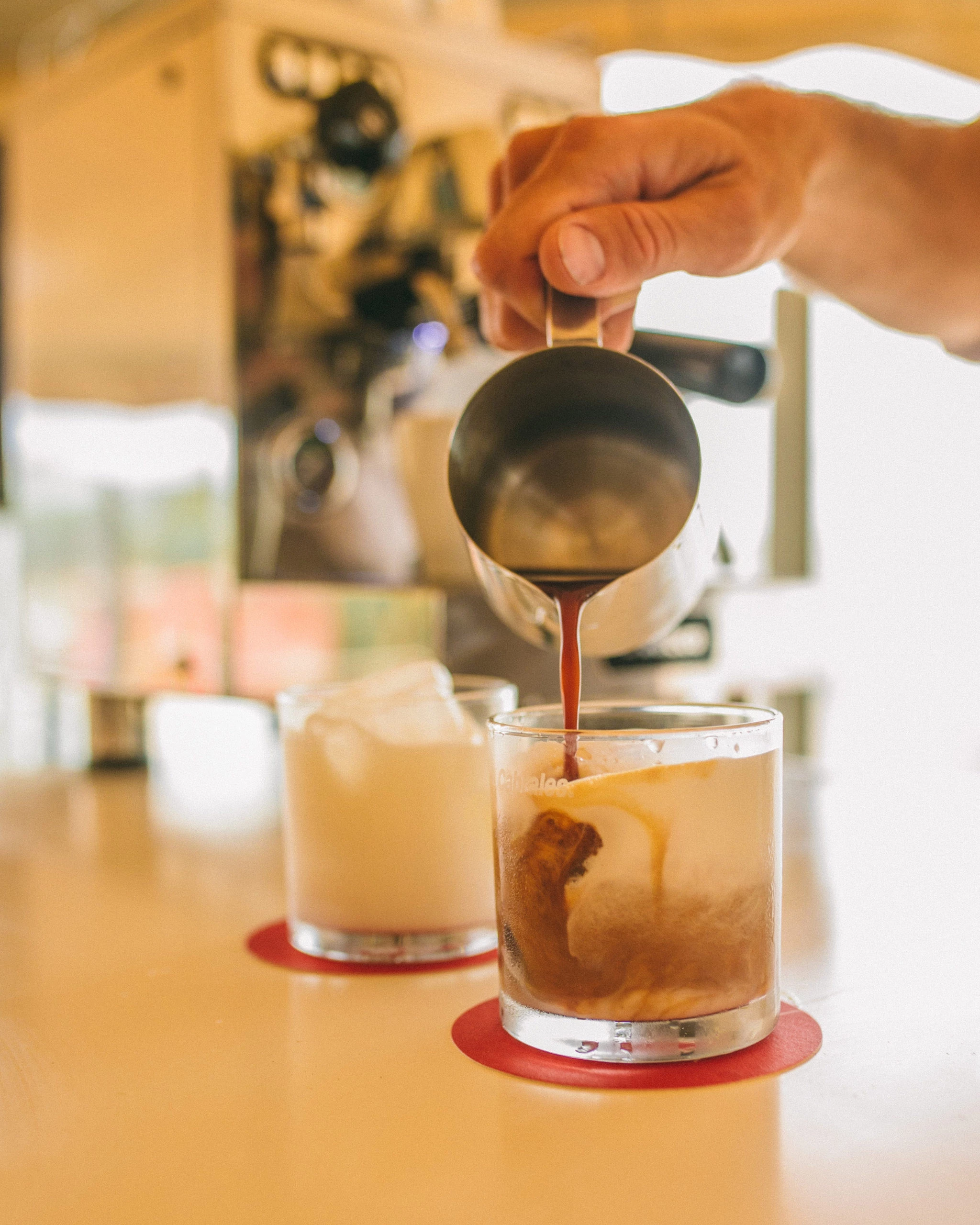 - Iced Latte: Completar un vaso de trago largo con hielo. Con la ayuda de una prensa francesa o una coctelera, emulsionar 250ml de leche fría. Después de servir la leche en el vaso con hielo, agregar doble shot de espresso Cabrales.