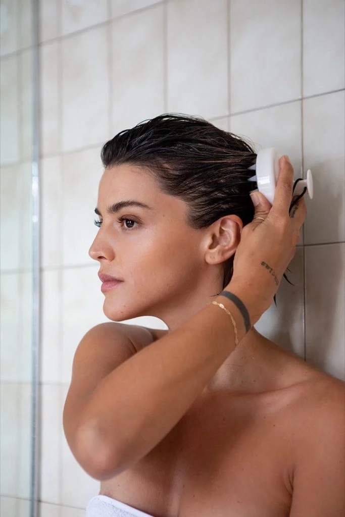 Entonces, Calu aparece usando un masajeador que ayuda a estimular el flujo sanguíneo y exfoliar suavemente el cuero cabelludo.