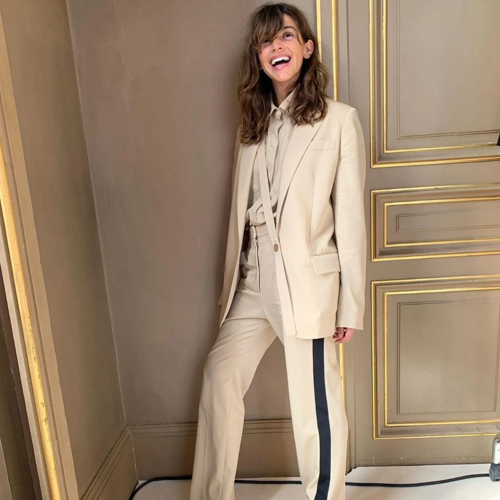 La actriz se vistió con un total look color crudo de traje de saco y pantalón, más camisa. El pantalón, ancho, llevaba una franja vertical negra en el costado. Y acompañó con stilettos negros.