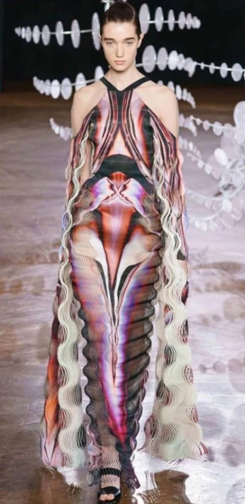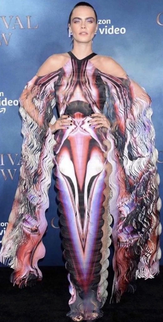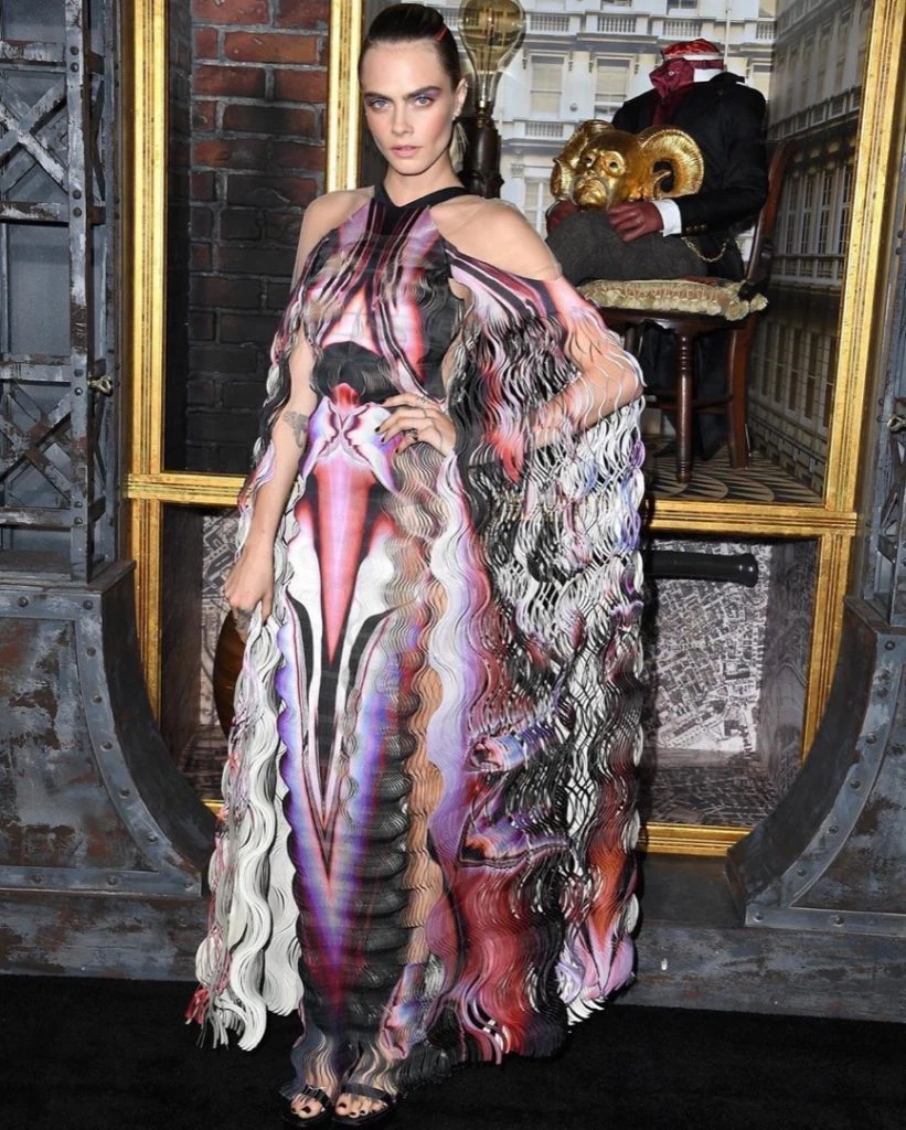 La actriz británica que da vida al personaje de Vignette Stonemoss llevó un vestido de seda lleno de movimiento y color, estilo psicodélico, de la diseñadora holandesa Iris van Herpen que, gracias a las formas, el estampado y los colores, jugaba con el efecto óptico y 3D. El vestido llevaba cuello halter, cut outs en los hombros, mangas XL con efecto volante y silueta ceñida hasta el piso. Todo con un estampado colorido en tono morado, negro y naranja, rosa y plateado. Además, Delevingne jugó con el maquillaje y el peinado.