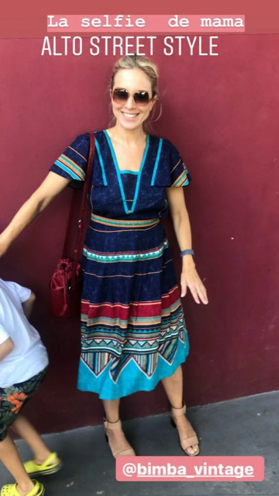 Se lookeó con un solero con estampa mosaico, muy años setenta. De largo midi y rayas multicolores, es un diseño de Bimba Vintage, la tienda de prendas vintage de una de sus amigas, Jazmín Rodríguez.