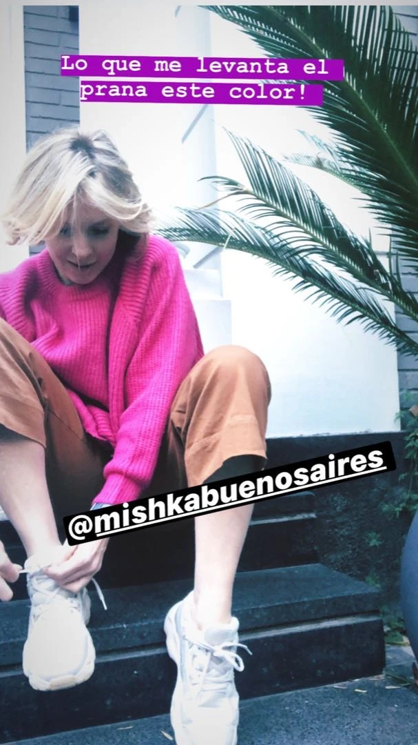 "No es que todo el tiempo la esté pasando genial. Pero cuando me baja el nivel no se me ocurre sacarme una foto. Llegando a los 100 días se empieza a poner dramático. #cuidémonosentretodos #colores #invierno #lana", posteó en su cuenta de Instagram junto a la foto en la que se destaca el look de polera de lana fucsia con pantalón dulce de leche (de Mishka Buenos Aires) y zapatillas.