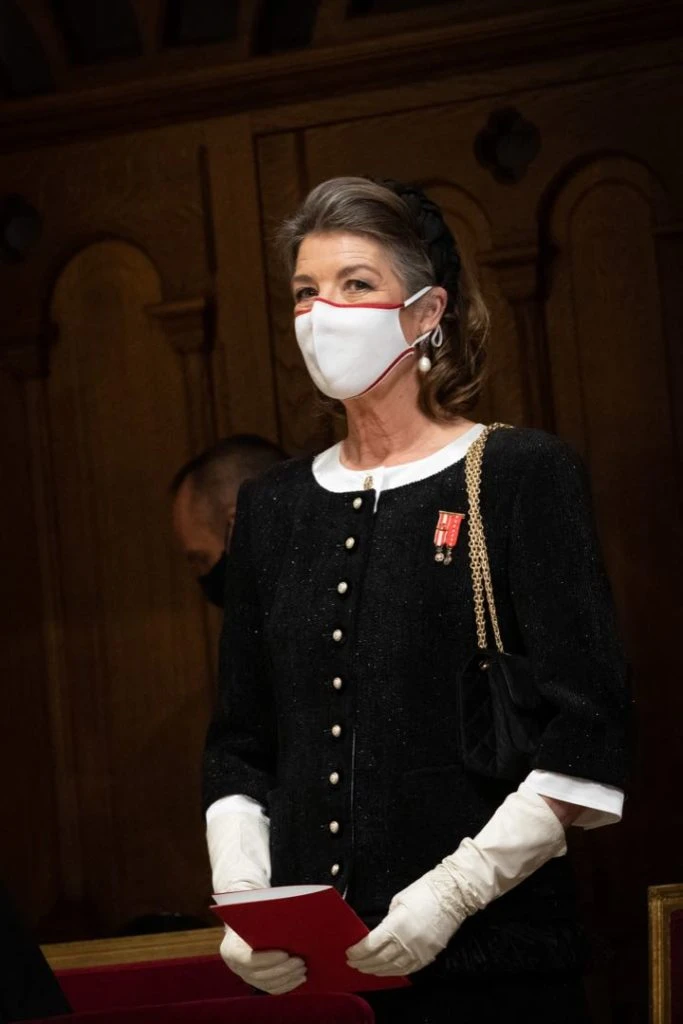 Con mucho estilo, Carolina de Mónaco combinó su nuevo look con un traje blanco y negro de Chanel, una elección habitual en ella. Y en la cabeza llevó una diadema trenzada, y por supuesto, no se olvidó del barbijo con la bandera del Principado de Mónaco.