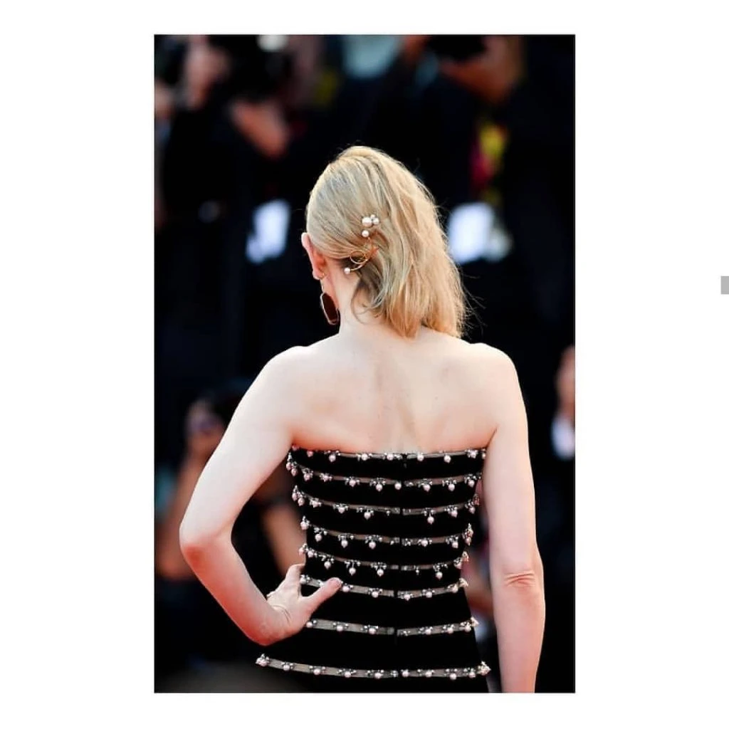 El peinado lo resolvió (o lo hizo su estilista) de la manera más elegante y sencilla a la vez. Muy fácil de hacer si tenés un corte de pelo bob. Lo peinó hacia un costado por detrás y le colocó un lindo broche con perlas, última tendencia. El pelo cae sobre un solo lado, dando un poco de textura y volumen a la zona de la capa más corta, a modo de flequillo.