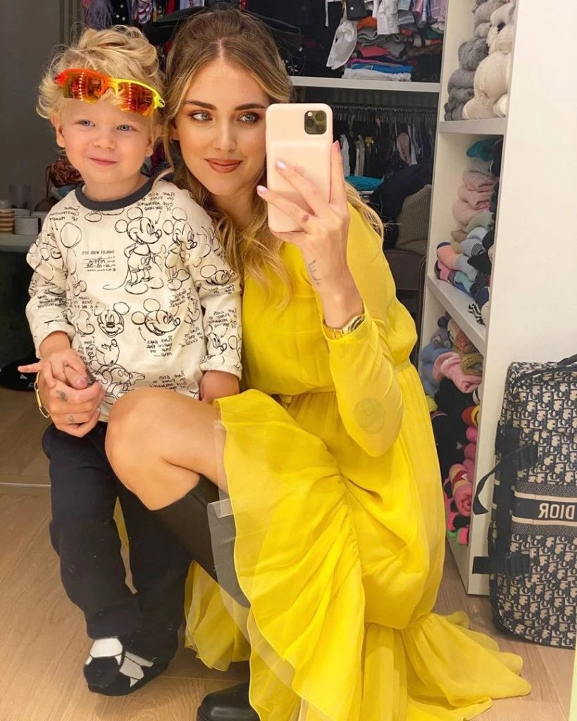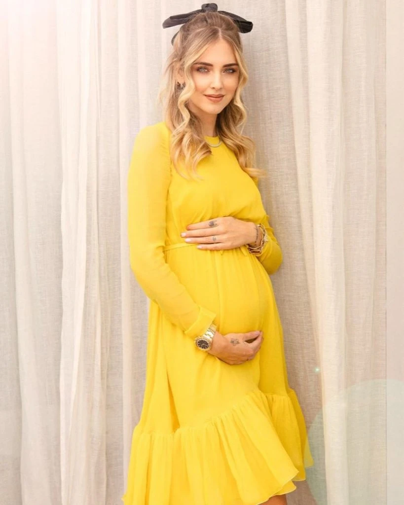 Chiara se vistió con un vestido amarillo de Giambattista Valli estilo "baby doll" y mostró su panza incipiente. Además se peinó con un moño de terciopelo negro igual que las modelos que llevaron la colección primavera verano 2021 en París Fashion Week.