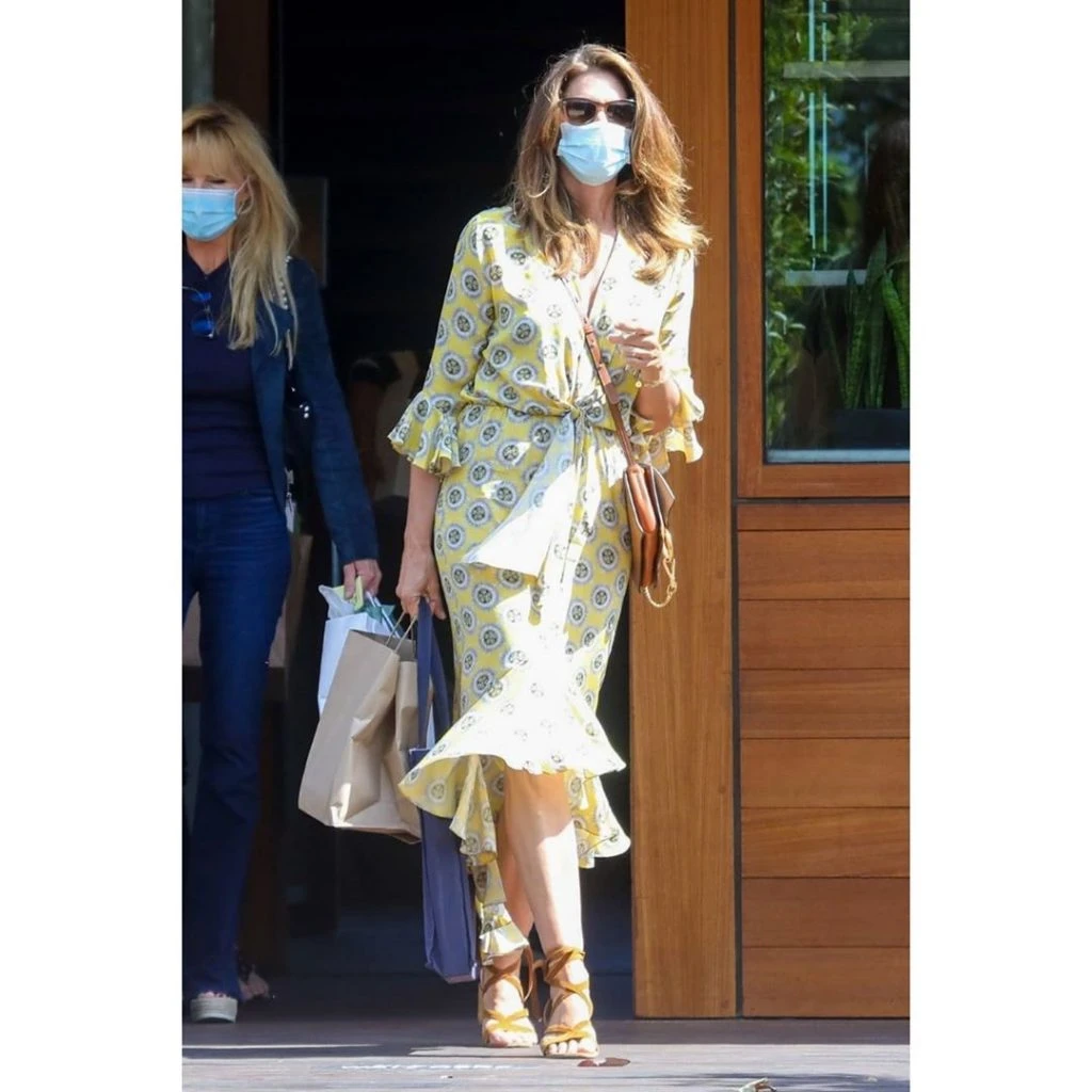 La supermodelo de los años 90 se mostró por las calles de Los Ángeles con un look súper chic y veraniego. El barbijo no opacó su elegancia.