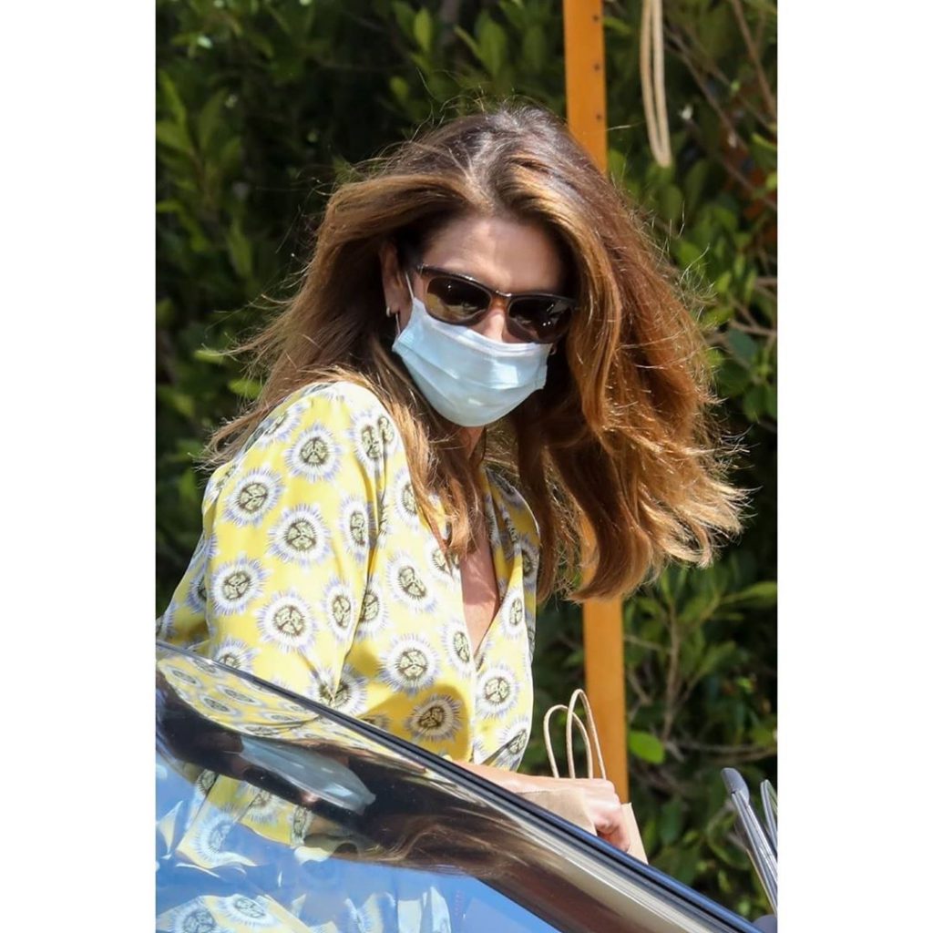La supermodelo de los años 90 se mostró por las calles de Los Ángeles con un look súper chic y veraniego. El barbijo no opacó su elegancia.