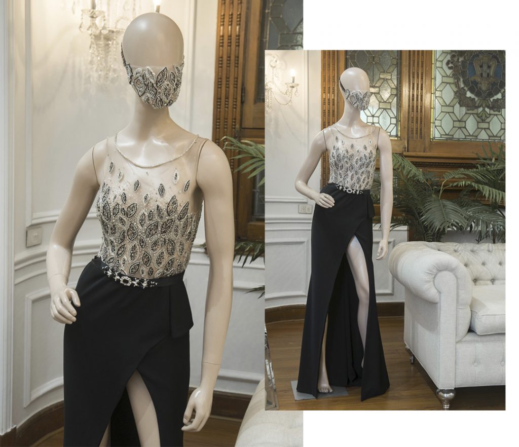 Vestido negro realizado en crep italiano de seda con cuerpo bordado a mano en chístales, barbijo con mismo diseño.