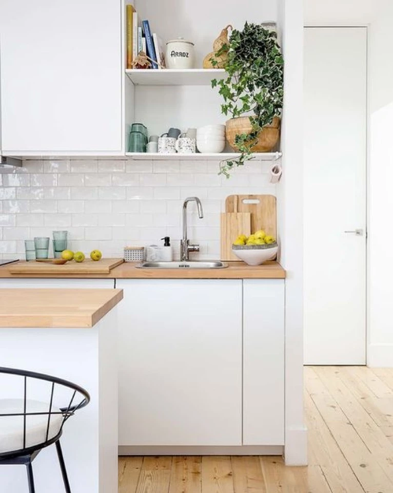 Combinar el blanco con detalles de madera dará como resultado una combinación moderna pero también súper cálida y acogedora. Una de las variantes más elegidas consiste en aplicar el blanco para una de las dos líneas de amoblamientos y dejar la madera -clara u oscura- para la otra parte. ¡Esta combinación nos encanta!.