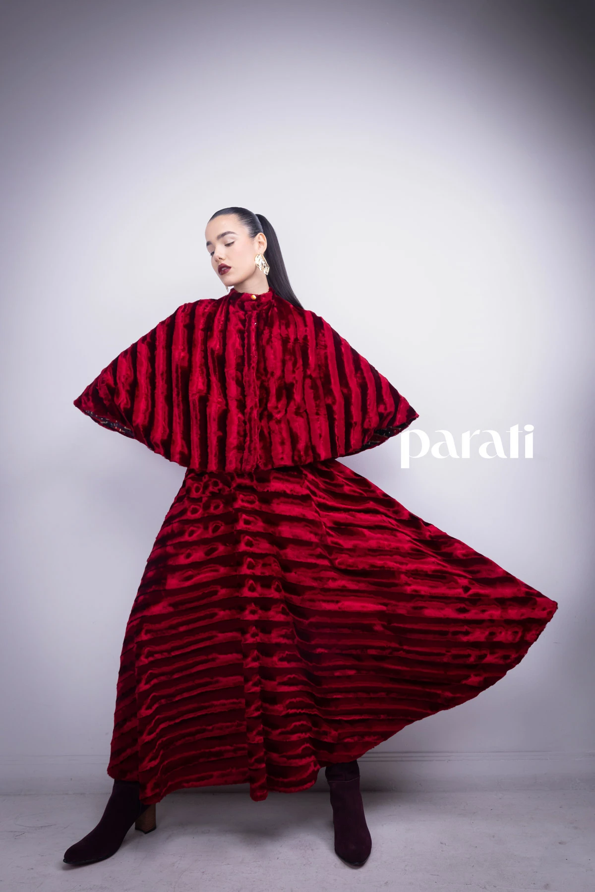 Una prenda que reaparece y conquista. La capa cubre desde los hombros de manera sofisticada. La nueva temporada invita a llevarla con una falda casi plato dando una silueta que se abre a medida que llega al suelo. La capa es ese abrigo que se siente como un abrazo cálido en una paleta intensa, sufrida y sanguínea.