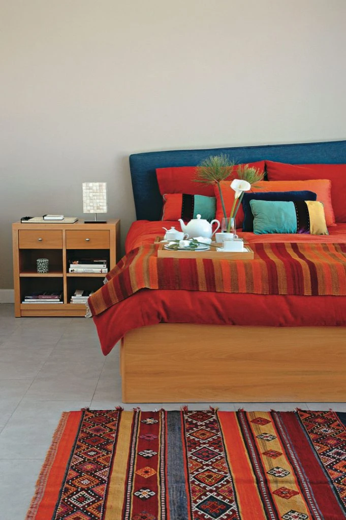 El dormitorio principal tiene una cama queen en guatambú con respaldo irregular tapizado en jean. La mesa de luz doble, de la misma madera en 60 x 40 cm., tiene cajoneras y espacios para guardado (Alejandro Rizzi) y lleva un velador de pergamino en treillage (Eugenio Aguirre). El color corre por cuenta del cubre edredón y los almohadones en corderoy y en composé de géneros ($ 250 y desde $ 45 c/u, Ramos Generales) y del kilim y el pie de cama turcos (Facundo Lhez).