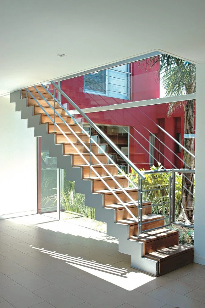 La obra del arquitecto Juan Trivelloni (http://@juantrivelloni) sobresale por su diseño en varios planos, con columnas que dejan entrever espacios mágicos en donde el verde es protagonista. Este plano abierto del exterior de la casa permite apreciar su perfecta geometría: un cubo de 270 m2 vestido casi por completo con un revestimiento rústico (Tarquini) color obispo. Un deck de lapacho recorre todo el perímetro. A un costado de la entrada se ubicó el garage, con piso de adoquines.