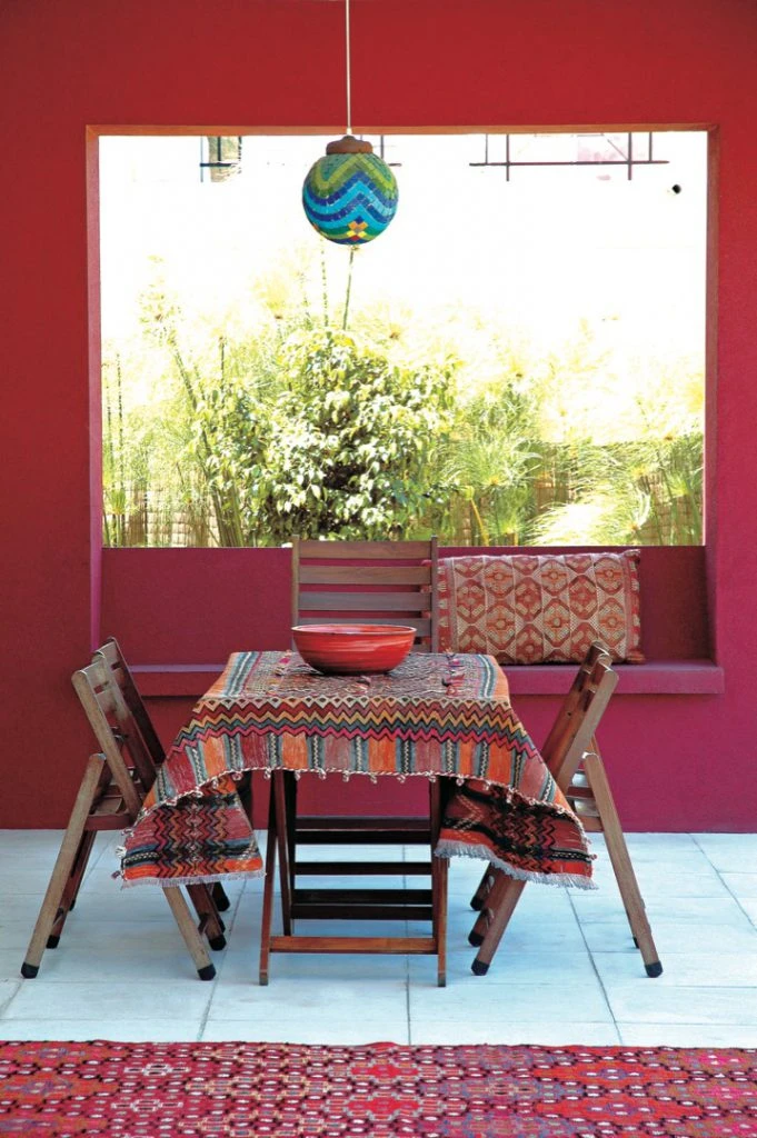 Para terminar, una mesa de madera de 80 x 80 cm. con sillas tijera (Easy) luce su impronta rústica en la galería coronada con una gran abertura hacia el jardín. La parte baja de la ventana lleva un sillón de mampostería trabajado con el mismo revestimiento color obispo que le da personalidad a la casa. El camino de piso turco, la alfombra marroquí y el almohadón tapizado en kilim suman más color. Como iluminación, una lámpara esfera de vidrio con venecitas de colores (Mercado de Pulgas de Dorrego).
