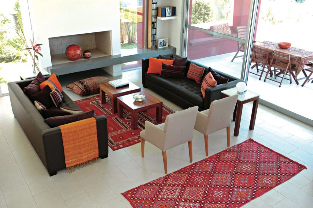 En el amplio living se enfrentan un sofá tapizado en gabardina camel con patas de madera (Laura O.) y otro de tres cuerpos en cuero ecológico capitoné color habano. En el centro se ubicaron dos mesas de madera de 60 x 60 cm. y en los costados se sumó una auxiliar algo más chica, con patas de madera y tapa de mármol de Carrara (Laura O.). Una alfombra turca y un camino marroquí (Facundo Lhez) aportan calidez y color. La chimenea es el único detalle de construcción en una pared armada casi por completo con paneles de vidrio. La decoración hace uso de pocos objetos pero de fuerte presencia. Como muestra basta echarle un vistazo al centro de mesa artesanal de cerámica en la gama de los naranjas y a las esferas artesanales de cerámica rústica pintadas a mano en visón y óxido. Los textiles tienen en esta casa la función máxima de encender el color. Los almohadones tapizados en kilims antiguos y el throw de seda cumplen ese rol desde uno de los sofás. Al fondo, sorprende la rigidez arquitectónica de la chimenea de mampostería con una base de cemento alisado que se extiende hacia un lado para darle forma a un estante flotante.