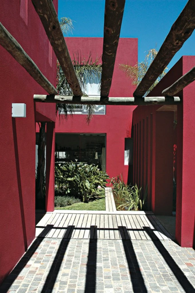 El arquitecto Juan Trivelloni diseñó esta casa cubo con patios y jardines internos, pérgolas y galerías que permiten diferentes puntos de encuentro. Muros en tonos intensos y contrastantes dejan su impronta desde la fachada hasta el interior.