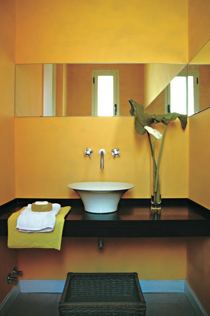 El toilette se pintó de un amarillo intenso. Sobre la pared estucada apoya la mesada flotante de madera oscura, con bacha de apoyo y grifería Temple (http://fvsa.com). Un espejo de 40 cm. de ancho por 1,40 m. de largo la secunda. Para el dormitorio infantil, en cambio, la apuesta fue por un alegre violeta. La cama con carrito de madera laqueada fue concebida como un sillón y lleva un acolchado a rayas y almohadones de algodón.