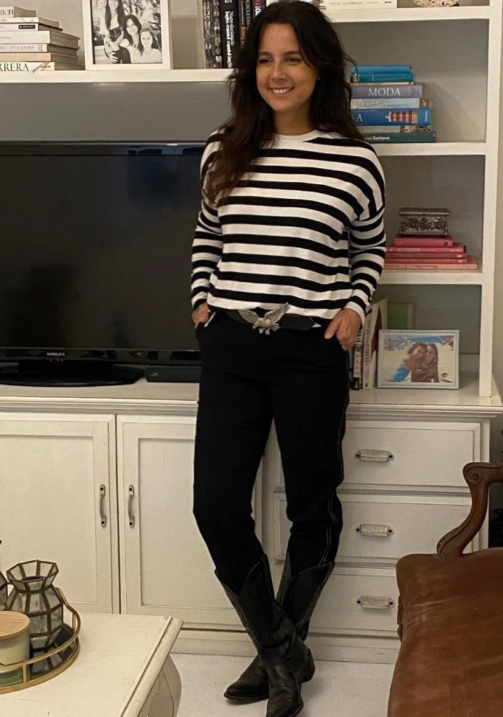 Combinarla con pantalones negros parecería una obviedad y un look clásico, pero llevala con accesorios de tendencia, como unas texanas y así le das una impronta diferente.