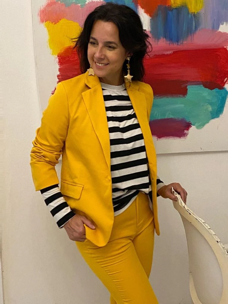 Otra opción es llevarla con un traje monocolor. Puede ser en un tono neutro, como beige o el clásico negro. Y si te animás sumala a un equipo amarillo. !ueda muy canchero.