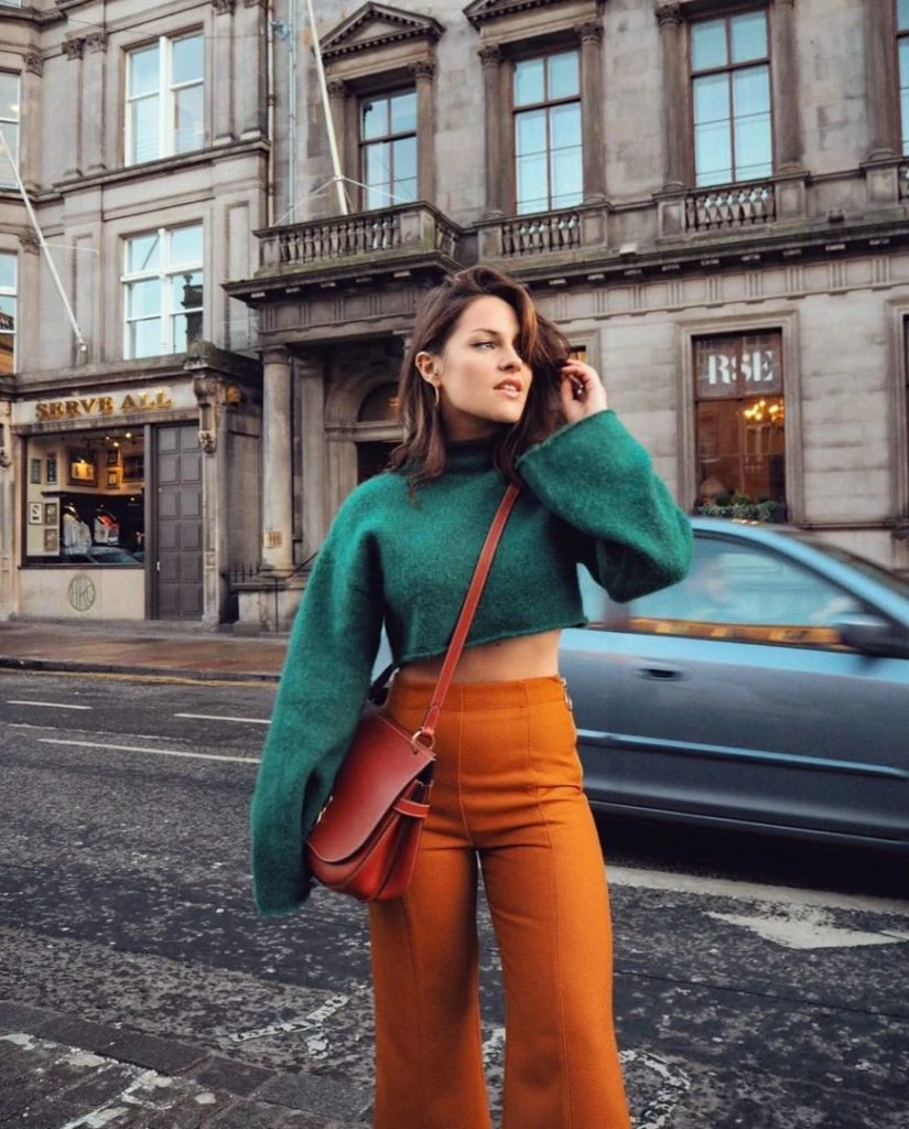 Pantalón oxford naranja, bandolera de cuero rojo más el verde el suéter: tres colores shocking tendencia de esta temporada.