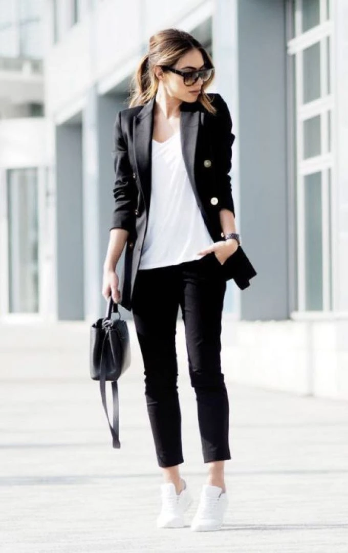 Si bien, la combinación más clásica es con un jean, la remera blanca también queda bien con un kimono y un pantalón súper ceñido o con un traje sastre, como en esta foto. o con un kimono sobre un pantalón bien ceñido al cuerpo.