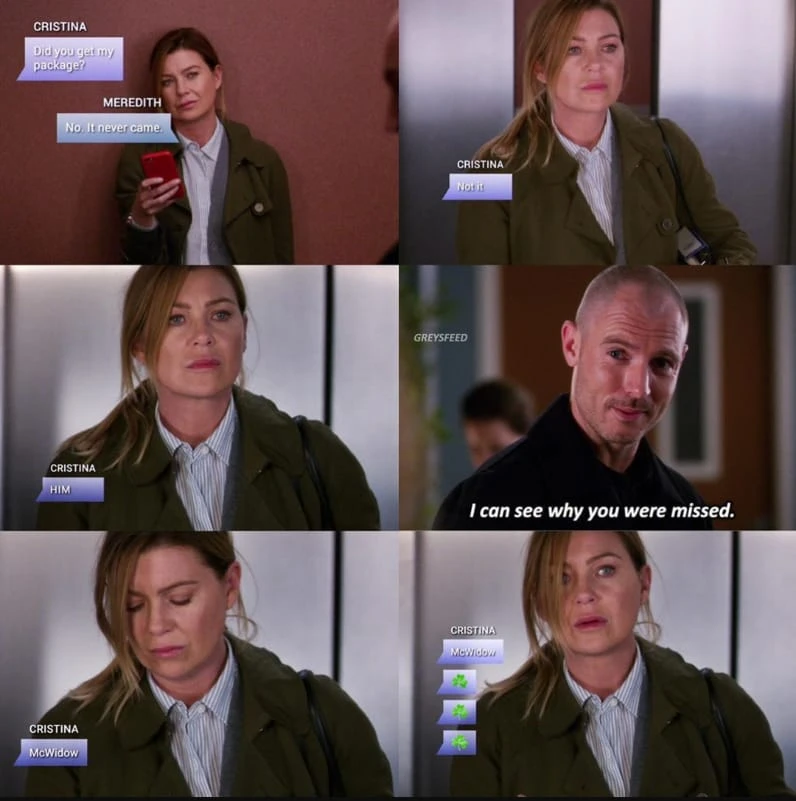 Y Meredith -que sale de una relación con Andrew DeLuca- no se lo esperaba. En pleno chat vía celular en el ascensor, Cristina Yang le preguntó a Meredith Grey si le había llegado "lo que le envió".