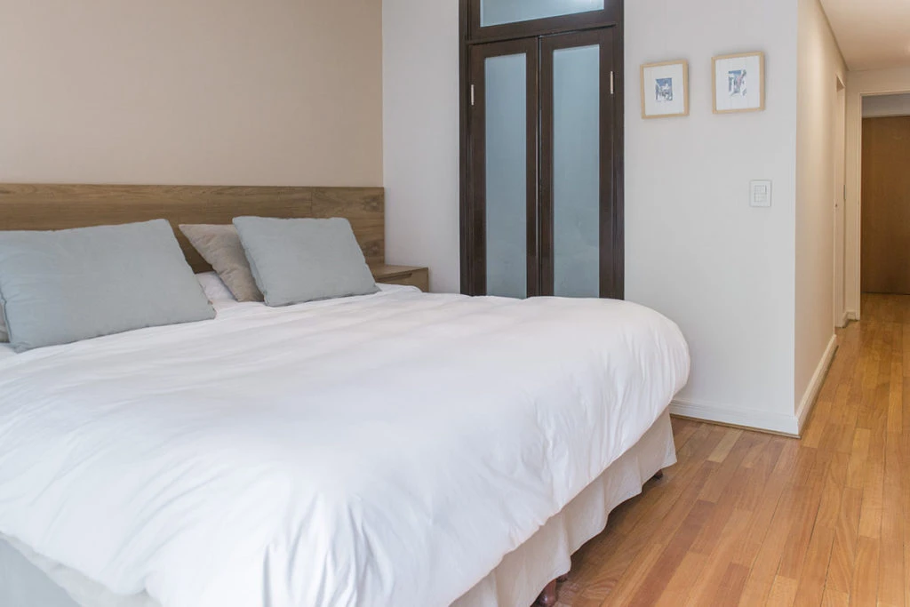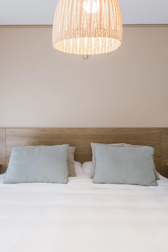 Un gran respaldo en Petiribi con mesas de luz colgantes -todo de Urbano Estudio- enmarcan la cama, pensada tambien en tonos neutros y géneros naturales, como el lino y algodón.