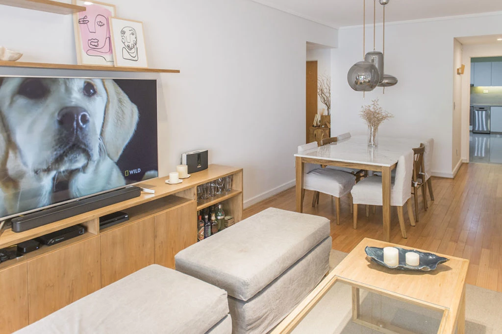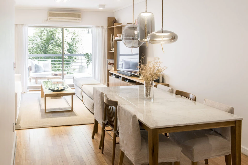 El living comedor integrado da una sensación de amplitud y se conecta fluídamente con el balcón. Para este ambiente, se usaron materiales nobles, una paleta neutra y objetos y texturas con cierta inspiración playera.