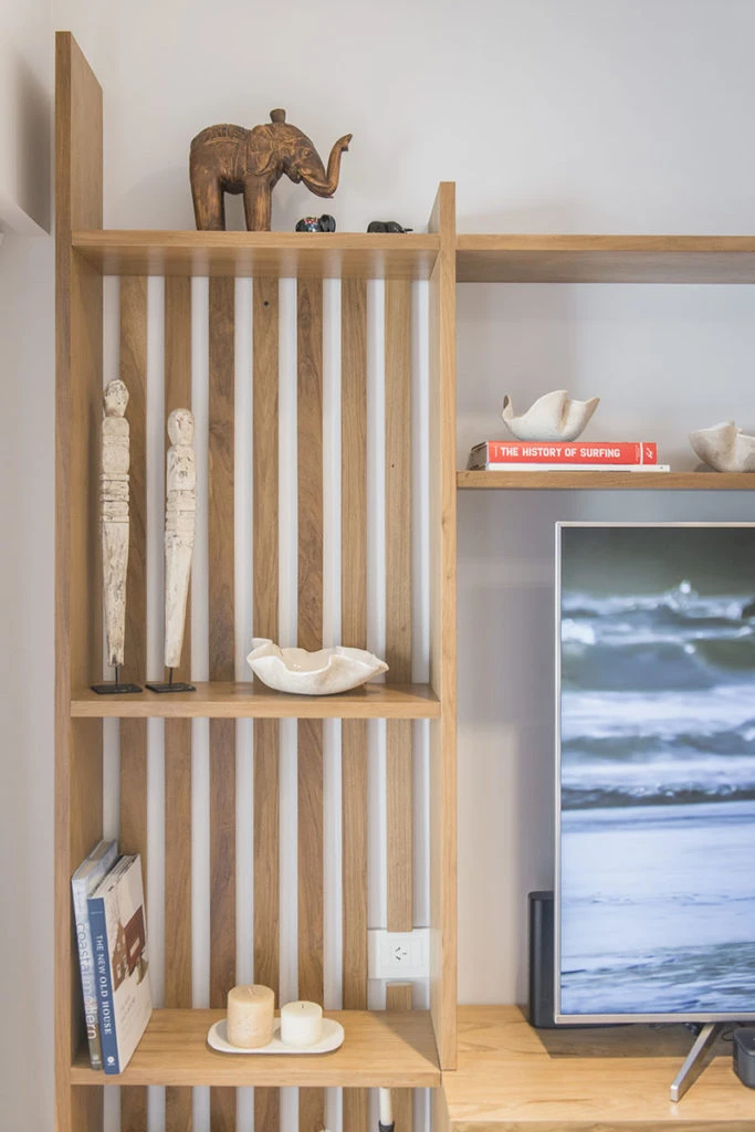 El estudio diseñó una biblioteca en Petiribi para contener la tevé, y a su vez generar un importante espacio de guardado. Es un modelo liviano y funcional, con líneas bien modernas.