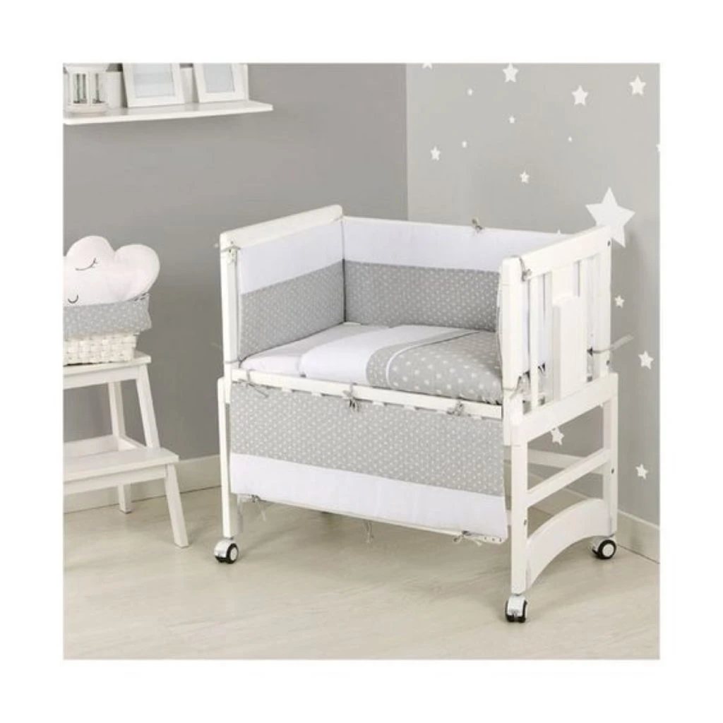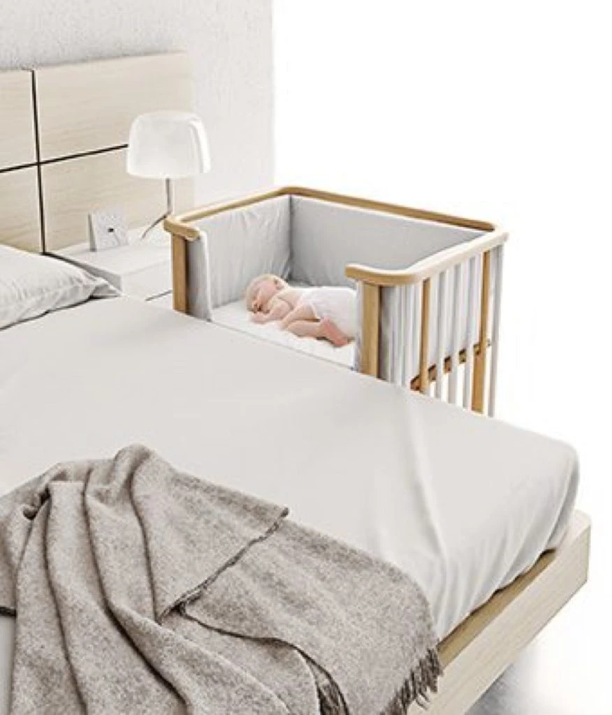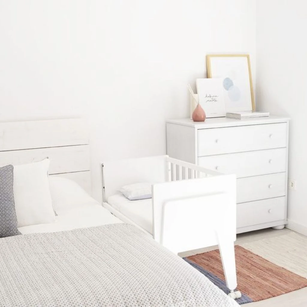Se trata de una cuna de madera que se adosa a la cama matrimonial acercando al bebé con un barral extraíble. De esta manera, la cuna se convierte en una extensión de la cama grande.