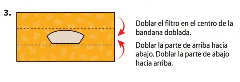 - Paso 2: Doblá el filtro en el centro de la bandana doblada. Doblá la parte de arriba hacia abajo. Doblá la parte de abajo hacia arriba.
