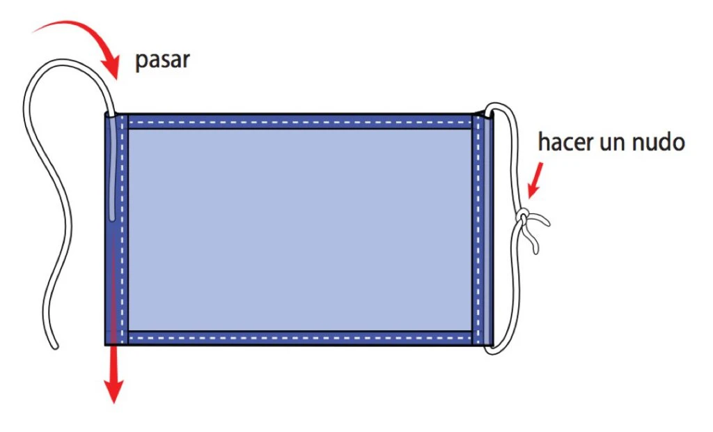 - Paso 4: Pasá el elástico a través del dobladillo más ancho a cada lado de la cubierta de tela para la cara. Estas serán las tiras que se enganchan en las orejas. ¿No tenés elástico? Usá cintas o bandas elásticas para el pelo.