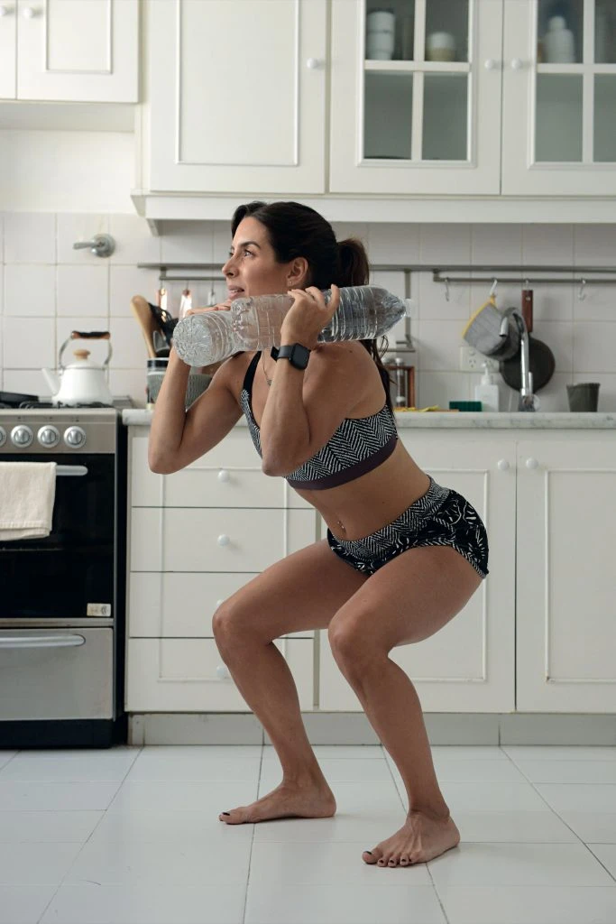 1. Cargá la botellas apoyadas sobre los hombros, con la espalda recta y los pies abiertos al ancho de caderas.