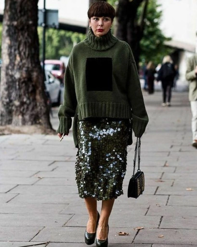 Las lentejuelas bordan vestidos, polleras y pantalones y se combinan con suéters XL, blazers a cuadros y blusas de color para bajarle esa impronta nocturna.