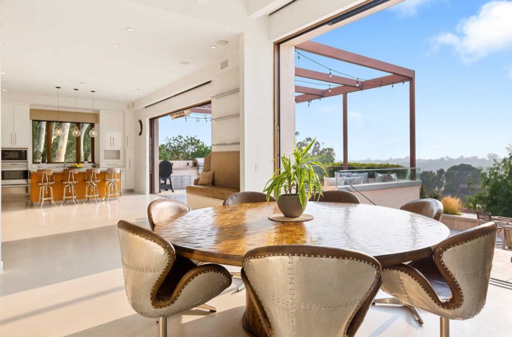 El comedor de la casa de Malibú que comparten el actor australiano y la modelo española, en pareja desde 2010 y padres de tres hijos, se resume en una mesa redonda con sillas de diseño, y aparece unido a una cocina de alta gama.