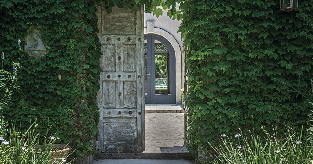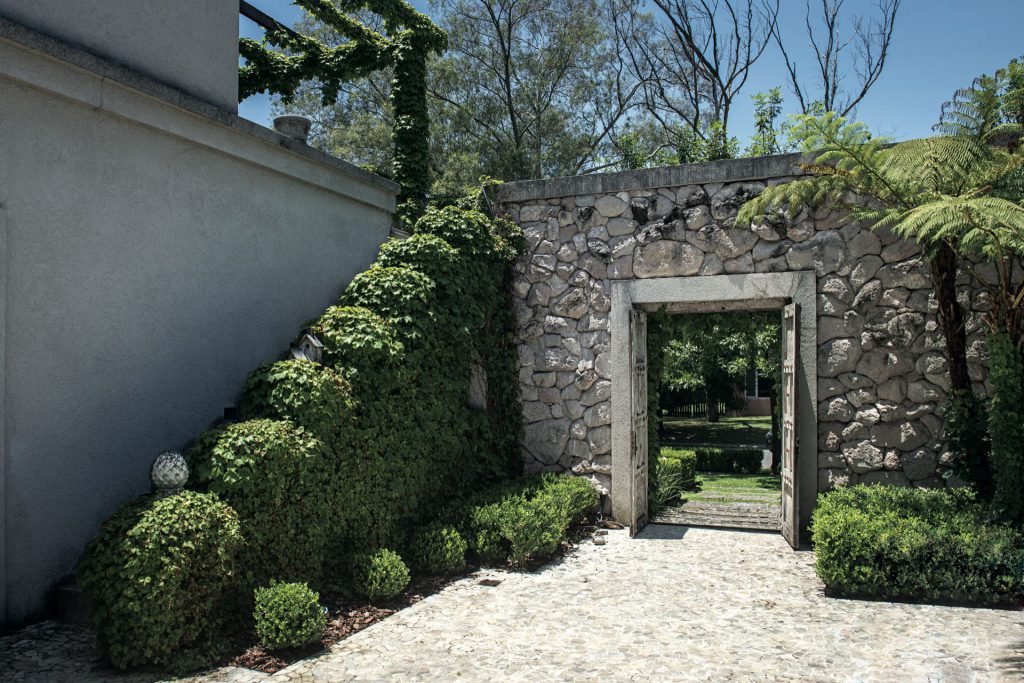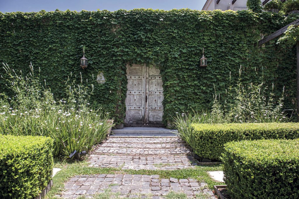 La entrada palaciega, con su muro totalmente tapizado por una amphelopsis que en otoño vira al bordó. La antigua puerta de madera, de doble hoja y herrajes en color negro, la consiguió en un pulguero, pero llegó del norte. Tiene 2,70 m de alto, con remaches antiguos de ferrocarril que acentúan su impronta. El camino de adoquines bien rústico, los canteros con buxus podados que la preceden (paisajismo a cargo de @vaninaboffa) y los dos faroles que la custodian a cada lado, refuerzan su espíritu medieval.