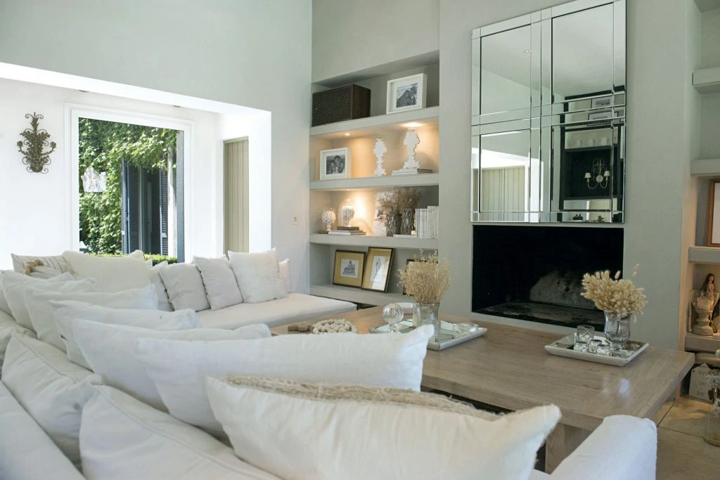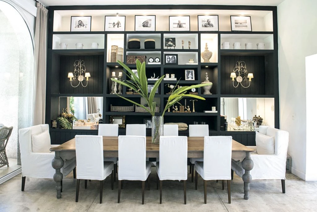 Dominique eligió para su casa una decoración clásica y atemporal, que no pasara de moda. Y en ese sentido, priorizó el juego de blanco y negro, bien net. Living y comedor están integrados, tanto espacialmente como en su ambientación. El primero se acomoda en torno a una chimenea empotrada que remata en un panel de espejos repartidos que agranda el ambiente. La completan, a cada lado, unas bibliotecas armadas con construcción en seco, con sus estantes de yeso retroiluminados en los que se lucen distintos objetos (todos de @dominicadeco). Un sillón en “L” muy grande y con muchos almohadones, todo en color blanco, y una mesa baja de madera clara, completan la puesta.