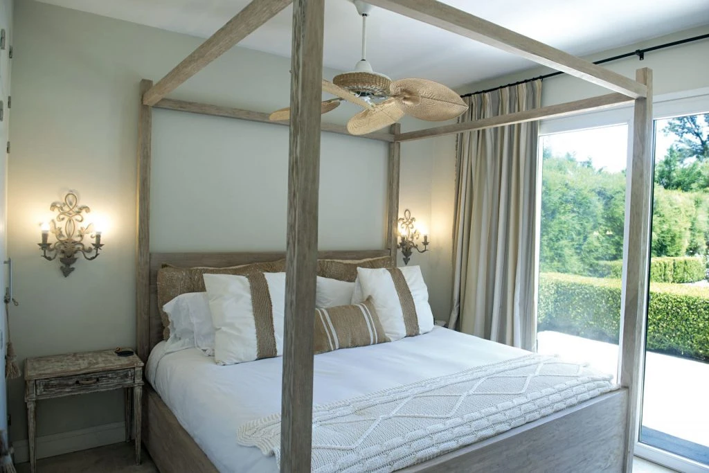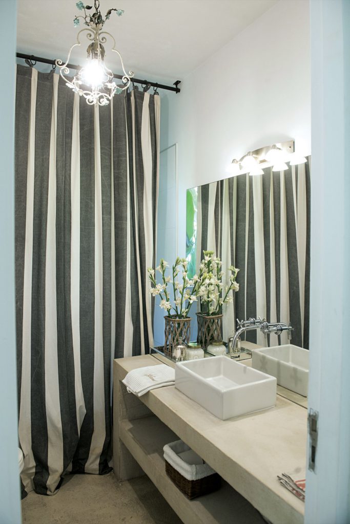 El cuarto principal tiene una cama con baldaquino de madera y, al centro, un ventiladores de techo con de aspas de ratán (www.desde asia.com). Las mesas de luz son de madera decapé y rematan en unos apliques antiguos con dos brazos para la luz de noche. El de Olivia -la hija, de 15 años- , tiene dos sommier: un deseo compartido por madre e hija, una porque cree que así el dormitorio parece más armado y la otra porque adora invitar a sus amigas. Ambos tienen respaldos tapizados que literalmente se meten en los huecos que deja la biblioteca armada con construcción en seco y pintada en gris plomo, con fotos y objetos varios como decoración. EL acolchado y los almohadones son de @angelinalinen y las acuarelas, de @lu.marot. Las cortinas dobles llevan géneros de @linosdelpacifico. Todos los baños de la casa son de líneas clásicas, con mesada de cemento alisado, bachas de apoyo, espejo pegado a filo y lámpara antique como iluminación. La pesada cortina a rayas esconde la bañera.