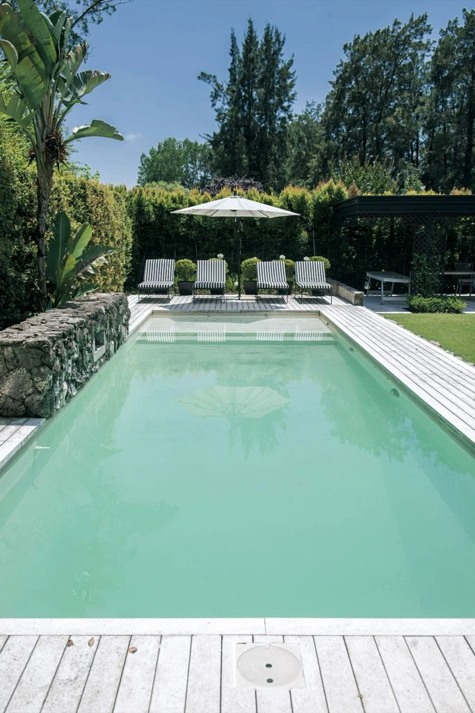 La pileta está enmarcada por un piso atérmico símil deck de ecomadera (@castellattoarq) y un murete bajo en piedra pómez en un lateral. Como cierre, en un extremo del decl, se sumó una pérgola de hierro con techo de maderitas y cubierta de policarbonato transparente. “Originalmente era de palos de eucaliptus, pero un día se cayó. Ahí aprendí la importancia de curarlos con brea y ponerles una base de cemento. Igual, a la hora de gastar, preferí invertir en una pérgola de hierro, con la calidez del techo interior de varillas de madera”, describe Dominique. La practicidad también se instaló en los mullidos sillones con fundas de cuerina náutica. Ejemplares de Eugenias imprimen verde en los laterales.