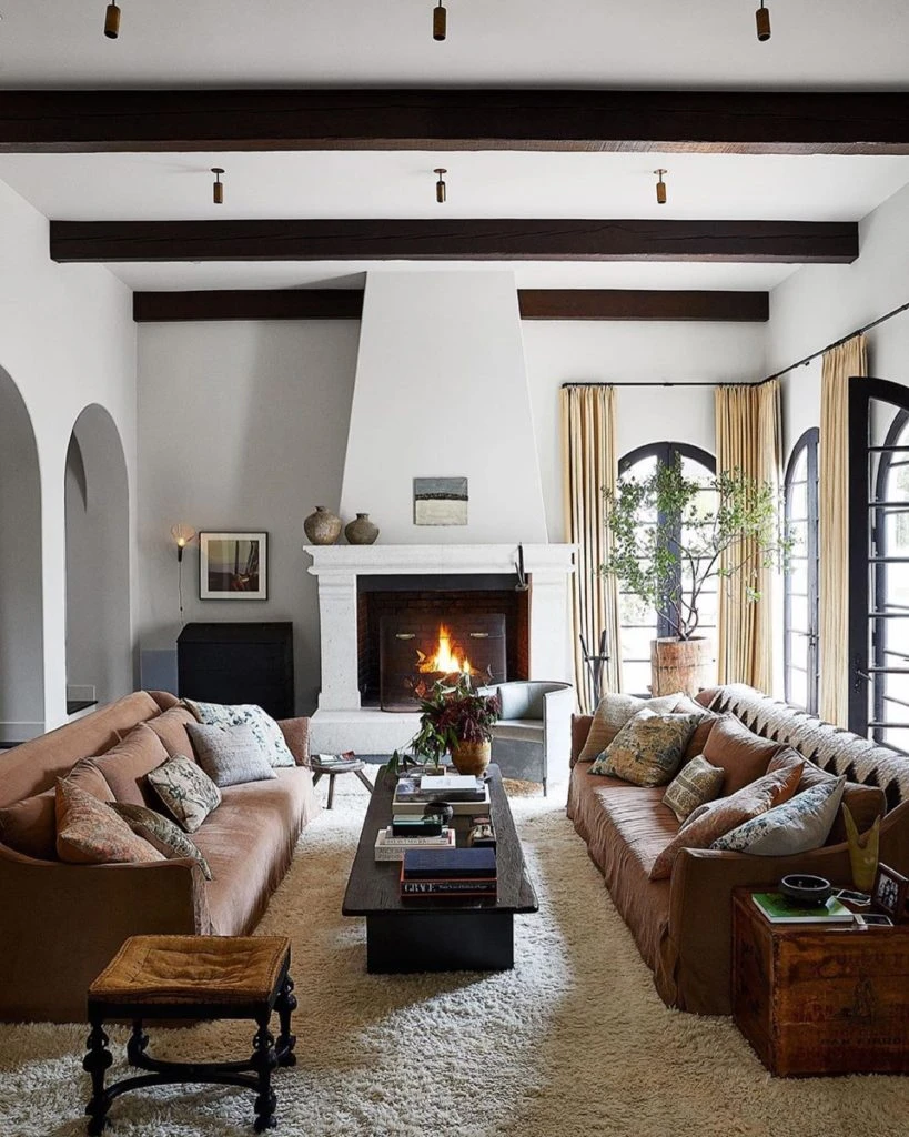 El living tiene una gran alfombra en color crudo y dos grandes sillones enfrentados en color marrón con muchos almohadones estampados al tono.